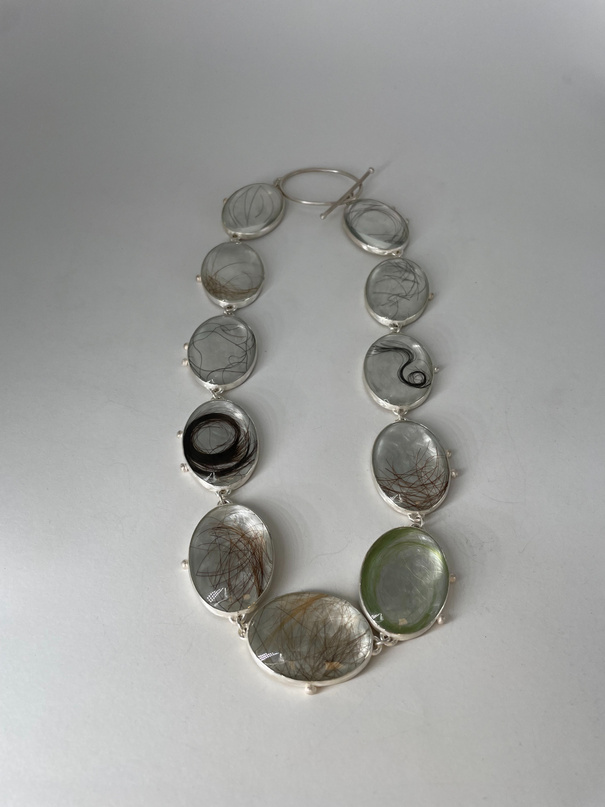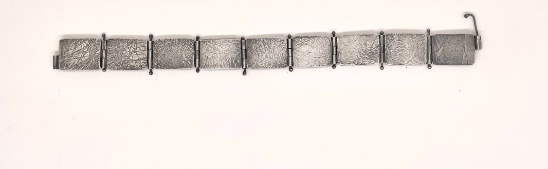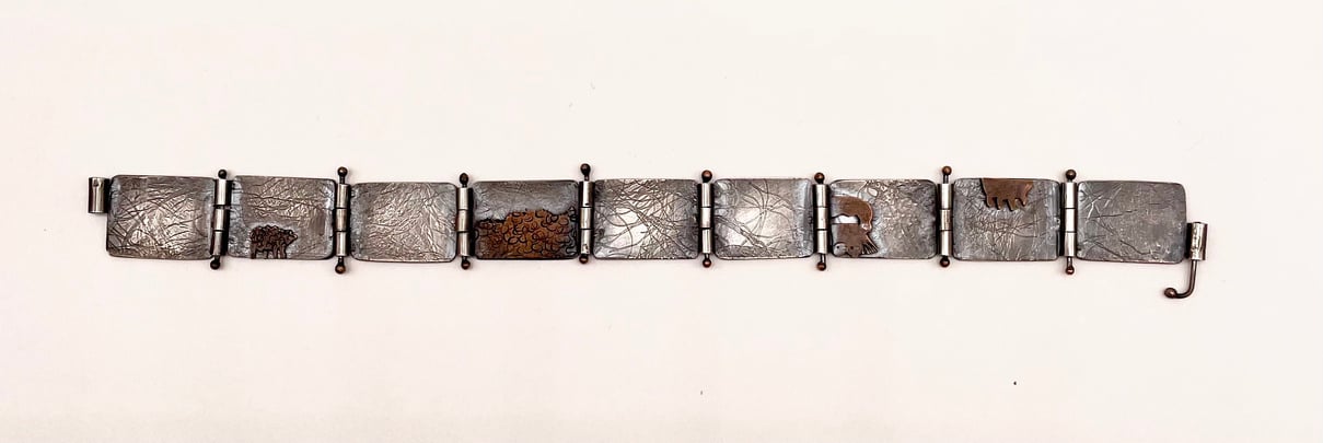 I roller printed silver sheet with hair for two reasons: it makes the bracelet have a hazy feeling, and so much of the history of New England’s nature has to do with sheep. I added four small important images using shibuichi, an alloy of copper and silver, to have a color contrast. The images consisted of a small sheep, a stone wall, a train, and cow utters. I continued the shibuichi in the rivets for the hinges to add contrast throughout the piece.