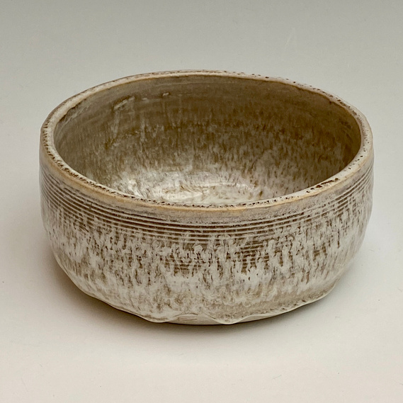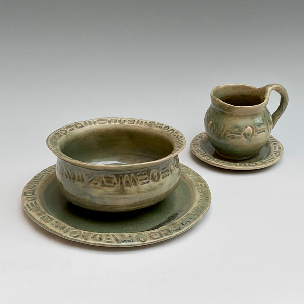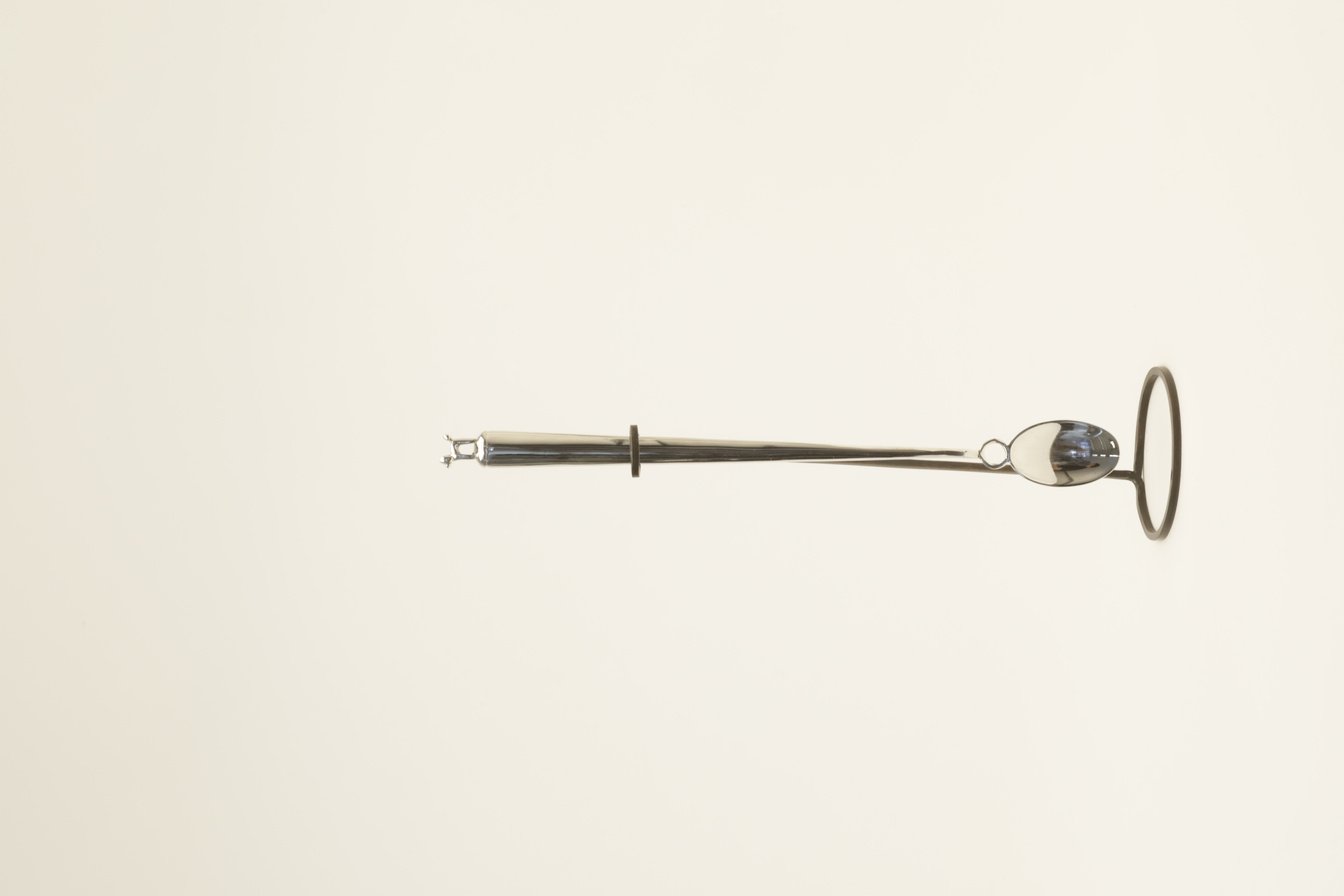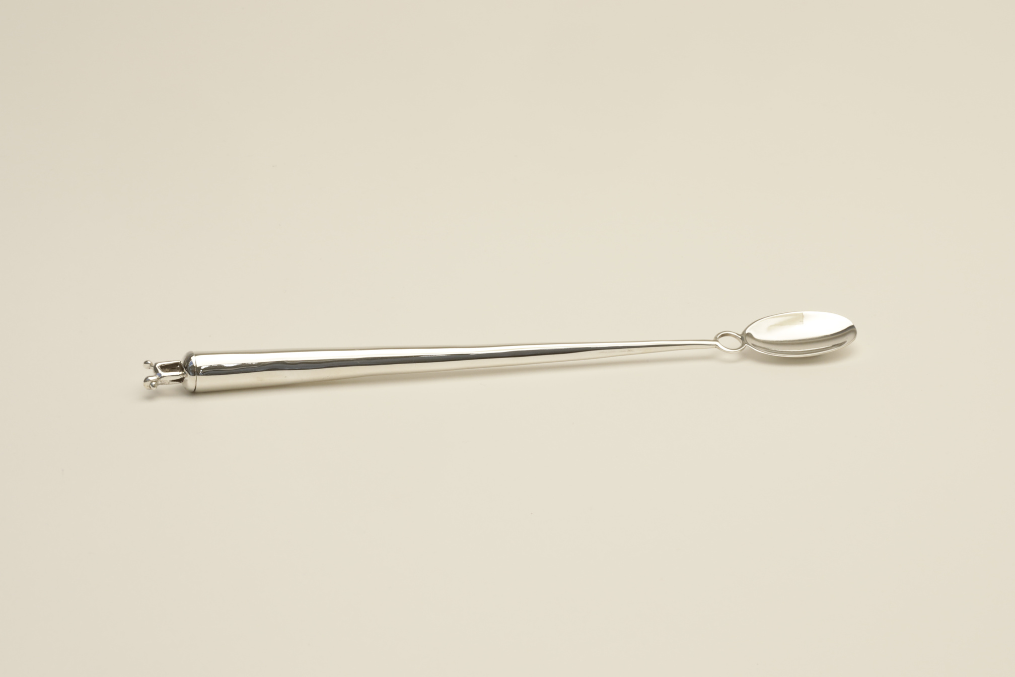 Starting with a speculum (long cone) to create the handle and a hydraulic pressed form to create the bowl of the spoon I connected them. To create a lid, I made a lip that would fit in the top of the speculum with a circle formed to be a half round. To honor her love of poodles, I hand carved one using needle files from a thick slab of silver. All with a high polish finish.