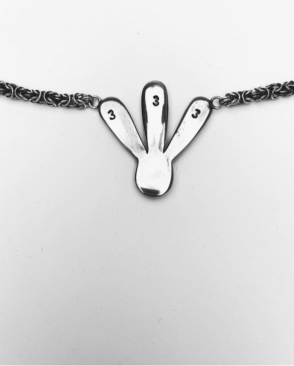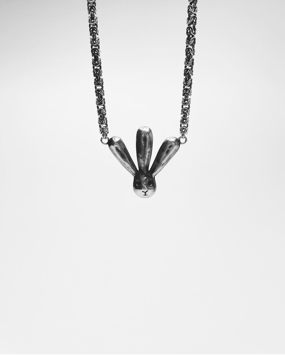 I hollow constructed the rabbit using a hydraulic press, chasing and repousse. I sawed 3 little 3s on the back of the rabbit. The chain is a Byzantine construction connected by a sister hook